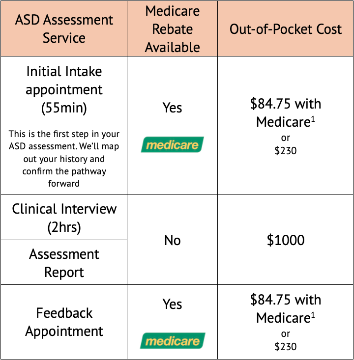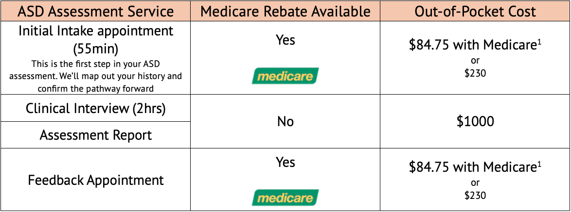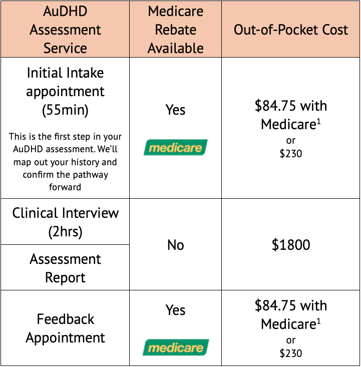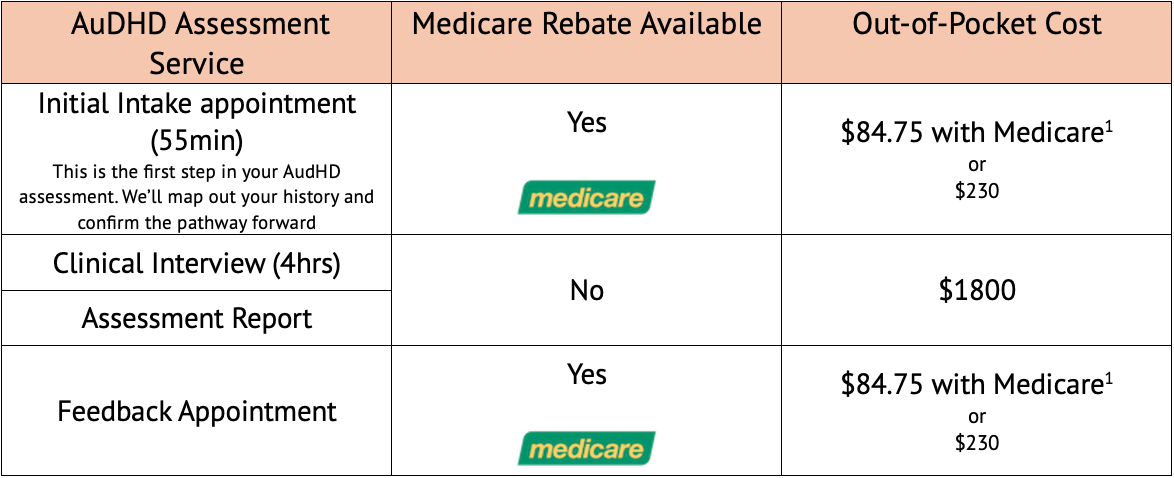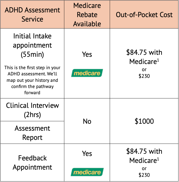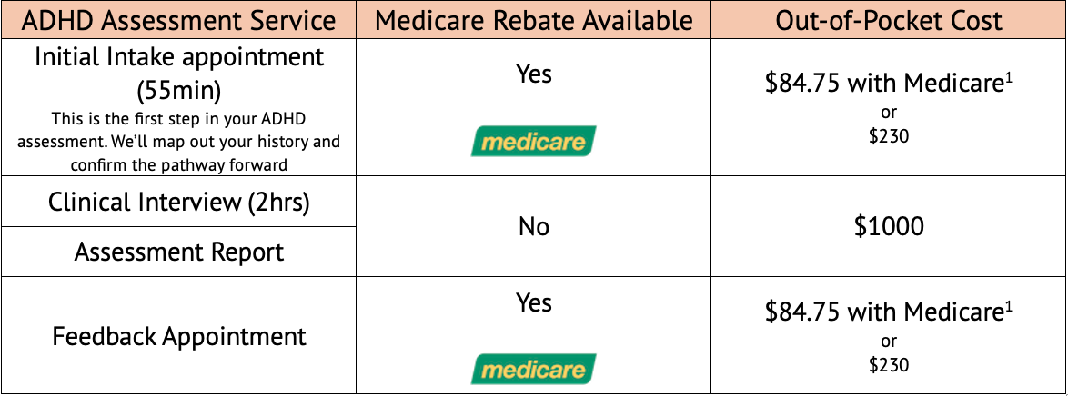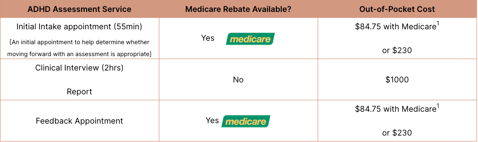 | ADHD Assessment Service | Medicare Rebate Available? | Out-of-Pocket Cost |